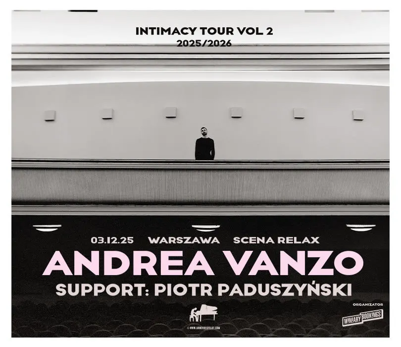 Wiodący wykonawca sceny neoklasycznej, Włoch Andrea Vanzo, zaprezentuje w Warszawie materiał ze swojego nowego albumu “Intimacy Vol. 2”, którego premiera zaplanowana jest na 10 października. Włoski kompozytor wystąpi 3 grudnia na Scenie Relax, gdzie towarzyszyć mu będzie Piotr Paduszyński. Andrea Vanzo to mieszkający w Bolonii muzyk i kompozytor, którego postminimalistyczna twórczość emanuje ciepłem i nostalgią. Jego kompozycje łączą nowoczesną muzykę klasyczną z elementami popu, tworząc unikalny pejzaż dźwiękowy. Zadebiutował w 2022 roku albumem “Intimacy Vol. 1”, na którym w ujmujący sposób oddaje swoje inspiracje włoskimi krajobrazami, relacjami międzyludzkimi, więzią z naturą i ideą wolności.Andrea w krótkim czasie podbił serca słuchaczy na całym świecie – po premierze debiutu wyprzedał europejską trasę, a jego cover utworu “Song of Storms” został uhonorowany amerykańską nagrodą G.A.N.G. (Game Audio Network Guild Awards). Vanzo to dziś jeden z czołowych artystów sceny neoklasycznej, a o wyjątkowości jego talentu będzie można przekonać się już niebawem – 10 października ukaże się jego drugi album, “Intimacy Vol. 2”, a 3 grudnia artysta zaprezentuje go na żywo w warszawskiej Scenie Relax.Piotr Paduszyński – pianista, kompozytor i producent muzyczny młodego pokolenia. Tworzy utwory wpisujące się w ramy muzyki neoklasycznej, ilustracyjnej i filmowej. Dzięki debiutanckiemu albumowi “Prześwit”, nagranemu w studio Leszka Możdżera, Piotr wygrał plebiscyt WARTO Gazety Wyborczej jako „Muzyczne Odkrycie Roku”. Artysta został wyróżniony w konkursie festiwalu FAMA 2025. Pod koniec października 2025 wydał swój drugi album “Zorze”. ANDREA VANZOsupport: Piotr Paduszyński 3.12.2025 / Warszawa, Scena Relax Punkty sprzedaży: www.winiarybookings.pl, Going, Empik Bilety. Szanowni Państwo. Prosimy o kupowanie biletów wyłącznie w autoryzowanych punktach sprzedaży. Poprzez kupno wejściówek od osób trzecich możecie zostać Państwo oszukani.Wstęp na koncert 13+ za pisemną zgodą rodzica. Poniżej 13 lat, wymagana obecność pełnoprawnego opiekuna.Wzór zgody: https://bit.ly/pisemna_zgoda_rodzica_wb Regulamin wydarzenia: https://bit.ly/regulamin_wydarzenia_wb W trosce o środowisko zachęcamy Was do pokazywania biletów na telefonie zamiast ich drukowania.