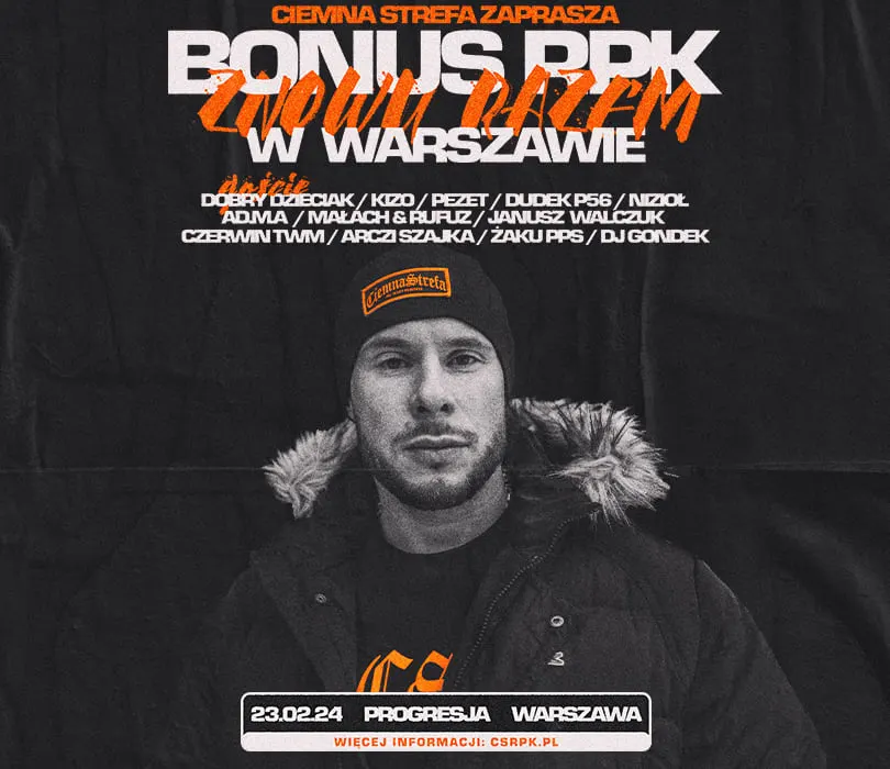 ZNOWU RAZEM! Bonus RPK powraca w wielkim stylu i już 23 lutego wystąpi w warszawskiej Progresji! Gościnnie na scenie pojawią się: Pezet, Kizo, Janusz Walczuk, Dobry Dzieciak, Czerwin TWM, DJ Gondek, Adma, Nizioł, Dudek P56, Arczi Szajka oraz Żaku PPS! Bonus RPK znany jest z twórczości charakteryzującej się tekstami poruszającymi społeczne tematy, problemy życiowe i refleksję nad rzeczywistością. Jego pasja do rapu zaczęła się już w młodym wieku, a jako nastolatek był członkiem nieistniejącej już grupy UNIKAT. W 2006 roku razem z raperem Wojtanem założył grupę RPK. Debiut solowy Bonusa RPK nastąpił w 2009 roku, gdy wydał album Wkurwiony Dzieciak , wydawnictwo nie tylko ugruntowało jego pozycję jako samodzielnego artysty, ale także zyskało uznanie za głębokie teksty, wnikliwy przekaz oraz unikalny styl. Raper w trakcie swojej kariery nawiązał współpracę z wieloma graczami polskiej sceny hip-hopowej, takimi jak DDK RPK, Czarny Furiat, Hipotonia WIWP, Kafar, Steel Banging, Nizioł, Rogal DDL, Rufuz, Sokół czy Quebonafide. Jego wszechstronność i głębokie teksty sprawiły, że stał się jednym z najbardziej rozpoznawalnych i szanowanych artystów w polskim rapie. Wpadaj do stolicy wspólnie świętować powrót Bonusa na scenę! BONUS RPK +goście: Pezet Kizo Janusz Walczuk Dobry Dzieciak Czerwin TWM DJ Gondek Adma Nizioł Dudek P56 Arczi Szajka Żaku PPS 23.02.2024 Warszawa, Progresja Szanowni Państwo. Prosimy o kupowanie biletów wyłącznie w autoryzowanych punktach sprzedaży. Poprzez kupno wejściówek od osób trzecich możecie zostać Państwo oszukani. Wstęp na koncert 13+ za pisemną zgodą rodzica. Poniżej 13 lat, wymagana obecność pełnoprawnego opiekuna. Wzór zgody: https://bit.ly/pisemna_zgoda_rodzica Regulamin wydarzenia: https://winiarybookings.pl/regulamin/ W trosce o środowisko zachęcamy Was do pokazywania biletów na telefonie zamiast ich drukowania. ➡BONUS RPK ?https://www.facebook.com/bonusrpk/ ?https://www.instagram.com/bonusrpk_official/ ?”HYMN ULICY”: https://www.youtube.com/watch?v=m8b10KnHCac ?”OD ZAWSZE NA ZAWSZE”: https://www.youtube.com/watch?v=JF12cgifV3k ?”OPOWIEŚCI Z KRYPTY”: https://www.youtube.com/watch?v=iqY1Frk545s --------------------------------------- Wpadaj na Instagram ➡ http://bit.ly/Nasz-instagram Polub nasz profil ➡ http://bit.ly/Nasz--Facebook