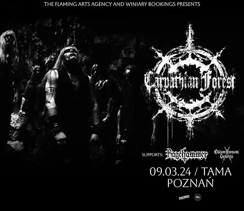 Norwegowie z Carpathian Forest powrócą w marcu do Polski na 3 koncerty! Dowodzona przez Nattefrosta black metalowa grupa wystąpi kolejno w poznańskiej Tamie (9.03), katowickim P23 (10.03) oraz w warszawskim klubie Proxima (11.03). Podczas wszystkich 3 wieczorów Norwegom towarzyszyć będą 2 dobrze znane, rodzime składy - krakowski Ragehammer oraz łódzkie Odium Humani Generis. Założony w 1990 roku przez Nattefrosta i Nordavinda Carpathian Forest to nazwa, której słuchaczom najciemniejszej odmiany ekstremalnego metalu przedstawiać szczególnie nie trzeba. Norwegowie przez blisko 35 lat za sprawą swojego dość skocznego, odgrywanego często w średnich i wolnych tempach black metalu zapracowali na miano jednego z pierwszoligowych zespołów w gatunku, czego potwierdzeniem jest choćby współpraca z wytwórniami Avantgarde Music czy francuską Season of Mist. Ostatni jak dotąd materiał formacji, “Likeim” z 2018 roku, ukazał się pod egidą Indie Recordings, a na wydawnictwie znajdziemy m.in. cover “All My Friends Are Dead” z repertuaru Turbonegro. Nie jest to jednak jedyny utwór w historii Carpathian Forest, który grupa wzięła na warsztat i poddała go własnej interpretacji - na albumie “Black Shining Leather” z 1998 znalazł się dość nieoczywisty strzał w postaci “A Forest” z repertuaru The Cure, natomiast na “We're Going to Hell for This, Over A Decade Of Perversions” (2002) znajdziemy scoverowane kawałki takich klasyków jak Venom, Discharge czy Darkthrone. Zespół występował na największych metalowych festiwalach jak Brutal Assault, Hellfest, Inferno czy Mystic, zagrał trasy, w tym m.in. u boku Behemoth, a niektórzy na pewno mają jeszcze w pamięci koncert u boku Gorgoroth w Krakowie sprzed 20 lat. Już w marcu dowodzona przez Nattefrosta grupa powróci do Polski na 3 koncerty, które odbędą się kolejno w Poznaniu, Katowicach oraz Warszawie. Black/thrashowe kommando Ragehammer za sprawą dwóch dużych albumów “The Hammer Doctrine (2016) i “Into Certain Death” (2020) zapracowało sobie na miejsce w czołówce polskich zespołów metalowych. Szybkość, agresja, bluźnierstwo - to wszystko cechuje występy krakowskiej formacji, a skoro ta maszyna jest już srogo rozpędzona styczniową trasą ze Stillborn i Devilpriest, to 3 koncerty u boku Carpathian Forest będą pokazem sczerniałego, thrashowego szaleństwa. Wszystkie wieczory otworzy coraz pewniej rozpychające się na scenie black metalowej łódzkie Odium Humani Generis. Kwartet w 2022 roku wystąpił na 2 europejskich trasach u boku Mgły i In Twilight’s Embrace, tym drugim towarzyszyli rok później na polskiej trasie “Non Miserere MMXXIII”, a do tego mogą pochwalić się udziałem na londyńskim Cosmic Void Festival, koncertami w Niemczech czy supportowaniem kanadyjskiego Spectral Wound na ich dwóch zeszłorocznych koncertach w naszym kraju. OHG nie zwalnia tempa, a już w niedalekiej przyszłości nakładem wytwórni Malignant Voices ukaże się ich najnowsza płyta “Międzyczas” i już gdzieś przebijają się głosy, że będzie to materiał, który może sporo namieszać. CARPATHIAN FOREST Supports: Ragehammer, Odium Humani Generis 9.03.2024 Poznań, Tama 10.03.2024 Katowice, P23 11.03.2024 Warszawa, Proxima Szanowni Państwo. Prosimy o kupowanie biletów wyłącznie w autoryzowanych punktach sprzedaży. Poprzez kupno wejściówek od osób trzecich możecie zostać Państwo oszukani. Wstęp na koncert 13+ za pisemną zgodą rodzica. Poniżej 13 lat, wymagana obecność pełnoprawnego opiekuna. Wzór zgody: https://bit.ly/WiniaryBookings_ZgodaRodzica Regulamin wydarzenia: https://winiarybookings.pl/regulamin/ W trosce o środowisko zachęcamy Was do pokazywania biletów na telefonie zamiast ich drukowania. --------------------------------------- Wpadaj na Instagram➡http://bit.ly/Nasz-instagram Polub nasz profil➡http://bit.ly/Nasz--Facebook