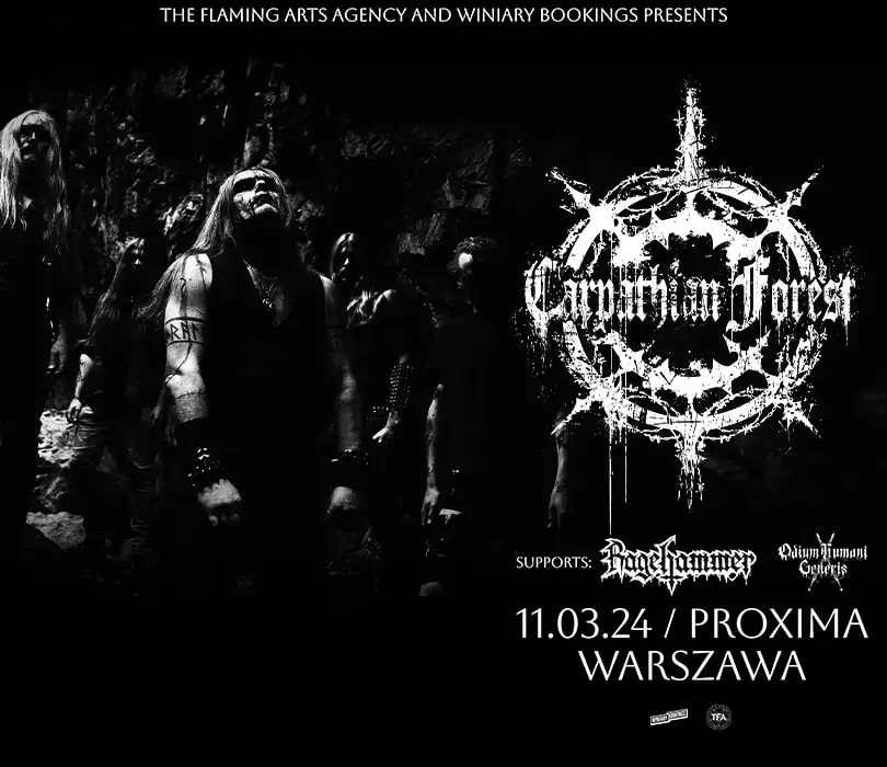 Norwegowie z Carpathian Forest powrócą w marcu do Polski na 3 koncerty! Dowodzona przez Nattefrosta black metalowa grupa wystąpi kolejno w poznańskiej Tamie (9.03), katowickim P23 (10.03) oraz w warszawskim klubie Proxima (11.03). Podczas wszystkich 3 wieczorów Norwegom towarzyszyć będą 2 dobrze znane, rodzime składy - krakowski Ragehammer oraz łódzkie Odium Humani Generis. Założony w 1990 roku przez Nattefrosta i Nordavinda Carpathian Forest to nazwa, której słuchaczom najciemniejszej odmiany ekstremalnego metalu przedstawiać szczególnie nie trzeba. Norwegowie przez blisko 35 lat za sprawą swojego dość skocznego, odgrywanego często w średnich i wolnych tempach black metalu zapracowali na miano jednego z pierwszoligowych zespołów w gatunku, czego potwierdzeniem jest choćby współpraca z wytwórniami Avantgarde Music czy francuską Season of Mist. Ostatni jak dotąd materiał formacji, “Likeim” z 2018 roku, ukazał się pod egidą Indie Recordings, a na wydawnictwie znajdziemy m.in. cover “All My Friends Are Dead” z repertuaru Turbonegro. Nie jest to jednak jedyny utwór w historii Carpathian Forest, który grupa wzięła na warsztat i poddała go własnej interpretacji - na albumie “Black Shining Leather” z 1998 znalazł się dość nieoczywisty strzał w postaci “A Forest” z repertuaru The Cure, natomiast na “We're Going to Hell for This, Over A Decade Of Perversions” (2002) znajdziemy scoverowane kawałki takich klasyków jak Venom, Discharge czy Darkthrone. Zespół występował na największych metalowych festiwalach jak Brutal Assault, Hellfest, Inferno czy Mystic, zagrał trasy, w tym m.in. u boku Behemoth, a niektórzy na pewno mają jeszcze w pamięci koncert u boku Gorgoroth w Krakowie sprzed 20 lat. Już w marcu dowodzona przez Nattefrosta grupa powróci do Polski na 3 koncerty, które odbędą się kolejno w Poznaniu, Katowicach oraz Warszawie. Black/thrashowe kommando Ragehammer za sprawą dwóch dużych albumów “The Hammer Doctrine (2016) i “Into Certain Death” (2020) zapracowało sobie na miejsce w czołówce polskich zespołów metalowych. Szybkość, agresja, bluźnierstwo - to wszystko cechuje występy krakowskiej formacji, a skoro ta maszyna jest już srogo rozpędzona styczniową trasą ze Stillborn i Devilpriest, to 3 koncerty u boku Carpathian Forest będą pokazem sczerniałego, thrashowego szaleństwa. Wszystkie wieczory otworzy coraz pewniej rozpychające się na scenie black metalowej łódzkie Odium Humani Generis. Kwartet w 2022 roku wystąpił na 2 europejskich trasach u boku Mgły i In Twilight’s Embrace, tym drugim towarzyszyli rok później na polskiej trasie “Non Miserere MMXXIII”, a do tego mogą pochwalić się udziałem na londyńskim Cosmic Void Festival, koncertami w Niemczech czy supportowaniem kanadyjskiego Spectral Wound na ich dwóch zeszłorocznych koncertach w naszym kraju. OHG nie zwalnia tempa, a już w niedalekiej przyszłości nakładem wytwórni Malignant Voices ukaże się ich najnowsza płyta “Międzyczas” i już gdzieś przebijają się głosy, że będzie to materiał, który może sporo namieszać. CARPATHIAN FOREST Supports: Ragehammer, Odium Humani Generis 9.03.2024 Poznań, Tama 10.03.2024 Katowice, P23 11.03.2024 Warszawa, Proxima Szanowni Państwo. Prosimy o kupowanie biletów wyłącznie w autoryzowanych punktach sprzedaży. Poprzez kupno wejściówek od osób trzecich możecie zostać Państwo oszukani. Wstęp na koncert 13+ za pisemną zgodą rodzica. Poniżej 13 lat, wymagana obecność pełnoprawnego opiekuna. Wzór zgody: https://bit.ly/WiniaryBookings_ZgodaRodzica Regulamin wydarzenia: https://winiarybookings.pl/regulamin/ W trosce o środowisko zachęcamy Was do pokazywania biletów na telefonie zamiast ich drukowania. --------------------------------------- Wpadaj na Instagram➡http://bit.ly/Nasz-instagram Polub nasz profil➡http://bit.ly/Nasz--Facebook