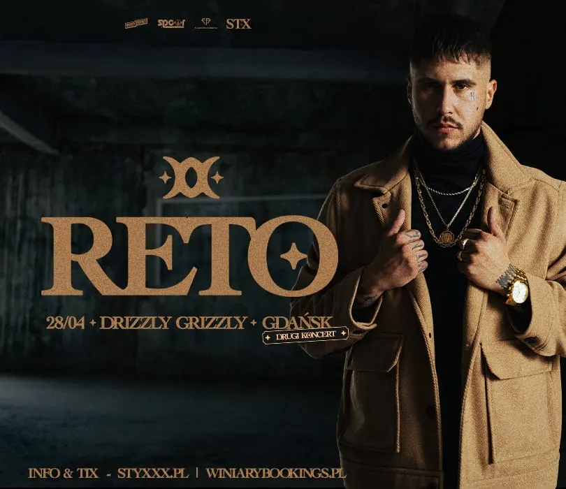 **Z uwagi na sold out w Gdańsku dodajemy drugi koncert dla wszystkich fanów, którzy nie zdążyli kupić biletów!** “Nawet nie zauważyłem kiedy stałem się więźniem swojego wizerunku. W pewnym momencie coś, co miało mi pomagać stało się moim przekleństwem, zresztą nie pierwszy i nie ostatni raz w tym życiu. Im bardziej ten element zaczynał mi przeszkadzać tym trudniejsze wydawało się pozbycie go. Czułem, że jest częścią mnie, że wpływa na odbiór mojej osoby, że bez niego może nie być tak samo. I nie będzie. Ale w końcu zrozumiałem że nie musi, że nie powinno. Zrozumiałem, że powinienem robić to co czuję, bo zazwyczaj, nawet pomimo blizn, wychodziło mi to na dobre. Teraz z dumą i satysfakcją prezentuje wam mój najnowszy numer, patrząc wam w końcu prosto w oczy. R” - tymi słowami Reto zapowiada singiel “Klej”, promujący nadchodzące, już szóste, studyjne wydawnictwo rapera. Album STYXXX to najlepsza okazja do tego, aby wyruszyć w kolejną trasę koncertową, ale wyjątkową, bo artysta pojawi się na niej w odmienionym wizerunku z całkiem nowym materiałem, na którym rozlicza się z samym sobą. Reto zaprasza na tę podróż wgłąb siebie wszystkich fanów. Płyta STYXXX dzięki swojej różnorodności jest dedykowana wszystkim sympatykom twórczości artysty. Nie zawiodą się fani agresywnych, ciętych linijek jak i spokojnych, refleksyjnych ballad w wykonaniu Igora. Reprezentant Spacerange pojawi się w 8 miastach, a na koncertach oprócz nowych hitów, nie zabraknie na pewno największych szlagierów z dyskografii Reto. Bądźcie z nami podczas tej wyjątkowej trasy! ✖️RETO “STYXXX” - trasa premierowa **drzwi 22:00 / koncert 23:00** ❌Wstęp na koncert 13+ za pisemną zgodą rodzica. Poniżej 13 lat, wymagana obecność pełnoprawnego opiekuna. Wzór zgody: https://bit.ly/WiniaryBookings_ZgodaRodzica **RETO** (Spacerange) https://www.facebook.com/23BOA https://www.instagram.com/reto_synku https://styxxx.pl “Klej” - https://www.youtube.com/watch?v=tsRsdtYe77k “Panta Rhei” - https://www.youtube.com/watch?v=85p7OtgMzz0 “Blask” - https://www.youtube.com/watch?v=GHE2KTp4odw