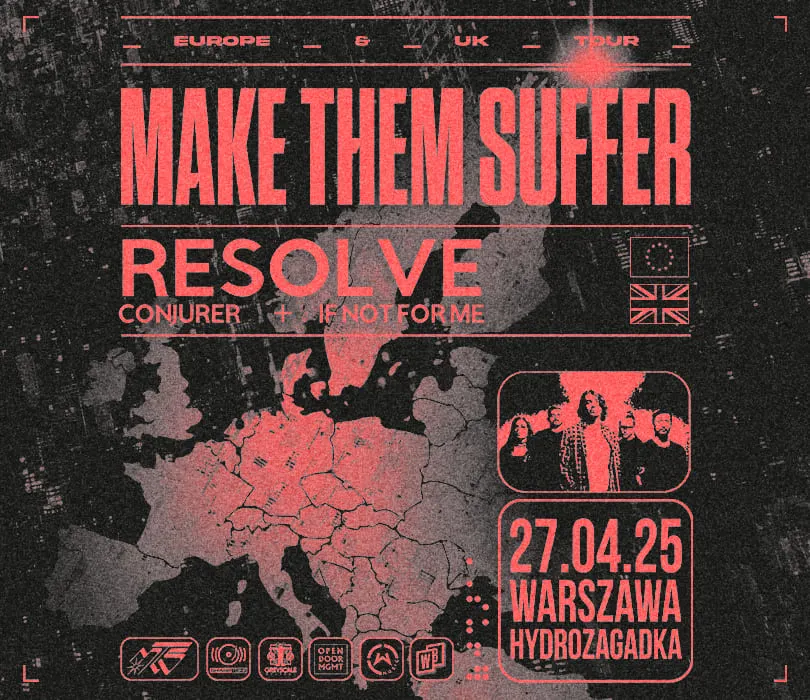 Make Them Suffer powraca do Polski! Australijczycy zagrają w warszawskiej Hydrozagadce 27 kwietnia. Publiczność rozgrzeje francuskie Resolve, If Not For Me oraz Conjurer. Weterani sceny core’owej z Australii nie przez przypadek grają już ponad 15 lat ze sobą. Make Them Suffer z początku łączyli deathcore z elementami symfonicznymi, jednak zasłynęli przede wszystkim z niesamowitej energii bijącej ze sceny. Aktualnie ich twórczość jest oparta na bardziej progresywnych, melodyjnych sekcjach,a w których często pojawia się żeński wokal, dzięki czemu prezentowane show jest definitywnie nawet bardziej widowiskowe. Wydany w 2024 album „Make Them Suffer”, pokazał ich nie słabnącą formę, a według niektórych wyznaczył poprzeczkę nie do przeskoczenia przez inne zespoły. Francuzi z Resolve nie są obcy polskiej widowni. W listopadzie 2024 otwierali wieczór przed While She Sleeps, a tym razem grając bezpośrednio przed headlinerem, znowu pokażą jak odpowiednio rozbujać widownię . Mimo klęski urodzaju w gatunku, mało jest zespołów równie umiejętnie i przebojowo balansujących pomiędzy melodyjnymi często balladowymi momentami, a wgniatającymi w fotel breakdown’ami. Przekonacie się o tym na żywo! If Not For Me gra metalcore nie tylko pełny energii, ale bardzo emocjonalny i introspektywny. W ich twórczości wyczuwalne są wpływy gigantów gatunku jak Killswitch Engage czy Bring Me The Horizon, jednak charakterystyczne dla grupy rozwiązania, ostatecznie definiują ich oryginalność. Na ich koncie widnieją dwa albumy studyjne, z czego wydany w 2024 roku „Everything You Wanted” pokazał, że grupa progresywnie rozwija swoją wizję, nie tracąc przy tym własnych fundamentów. Reprezentujące Wielką Brytanię Cojurer nie bierze jeńców. Absolutnie miażdżąca mieszanka sludge, death, black, i doom metalu sprawia, że słuchacze otrzymują wszystko co najlepsze z tych podgatunków. Ich ostatnie wydawnictwo „Pathos” zaprezentowane w 2022 roku, jest niczym innym niż absurdalnie agresywną odpowiedzią na otaczającą rzeczywistość, a wynikiem albumu o takiej energii jest show, którego nigdy nie zapomnisz. MAKE THEM SUFFER + Resolve + If Not For Me + Conjurer Europe & UK 2025 27.04.2025 / Warszawa, Hydrozagadka BILETY: Przedsprzedaż biletów rozpocznie się w piątek, 13 grudnia o godzinie 10:00 na https://bit.ly/MAKE_THEM_SUFFER_WWA Punkty sprzedaży: www.winiarybookings.pl, Going, Empik Bilety  Szanowni Państwo. Prosimy o kupowanie biletów wyłącznie w autoryzowanych punktach sprzedaży. Poprzez kupno wejściówek od osób trzecich możecie zostać Państwo oszukani.   Wstęp na koncert 13+ za pisemną zgodą rodzica. Poniżej 13 lat, wymagana obecność pełnoprawnego opiekuna. Wzór zgody: https://bit.ly/WiniaryBookings_ZgodaRodzica  Regulamin wydarzenia: https://winiarybookings.pl/regulamin/  W trosce o środowisko zachęcamy Was do pokazywania biletów na telefonie zamiast ich drukowania. ➡Make Them Suffer (Australia / Sharptone) – deathcore / progressive metalcore 🌐 https://www.facebook.com/makethemsufferau  🌐 www.instagram.com/makethemsuffer  🔊”Mana God”: https://www.youtube.com/watch?v=V7GGewgpzac  🔊”Doomswitch”: https://www.youtube.com/watch?v=vSW5gBfdR_8 🔊”Oscillator”: https://www.youtube.com/watch?v=PnWP7cAf-bk  Resolve (Francja / Arising Empire) – metalcore  https://www.facebook.com/resolveofficial   https://www.instagram.com/resolveofficial/  🔊”Smile”: https://www.youtube.com/watch?v=B5M9G0TQiEE 🔊”Sandman”: https://www.youtube.com/watch?v=mKIlJvrkeXc 🔊” Molotov”: https://www.youtube.com/watch?v=epZcoaLh2Cs ➡If Not For Me (USA / Thriller Records) – metalcore 🌐 https://www.facebook.com/IfNotForMe 🌐 https://www.instagram.com/ifnotforme/ 🔊”Feel Me Now”: https://www.youtube.com/watch?v=TN77NDTZT9c 🔊”Say It To My Face”: https://www.youtube.com/watch?v=l0qOjdIZfcA 🔊”Demons”: https://www.youtube.com/watch?v=baARB2XPiLs ➡Conjurer (Wielka Brytania / Nuclear Blast Records) – doom metal / black metal / sludge 🌐 https://www.facebook.com/conjureruk 🌐 www.instagram.com/conjureruk 🔊”It Dwells”: https://www.youtube.com/watch?v=mjzFuNeAwNQ 🔊”Rot”: https://www.youtube.com/watch?v=nQy90xn-zvE 🔊”The Mire”: https://www.youtube.com/watch?v=sTFFMHmzIkQ --------------------------------------- Wpadaj na Instagram➡http://bit.ly/Nasz-instagram Polub nasz profil➡http://bit.ly/Nasz--Facebook
