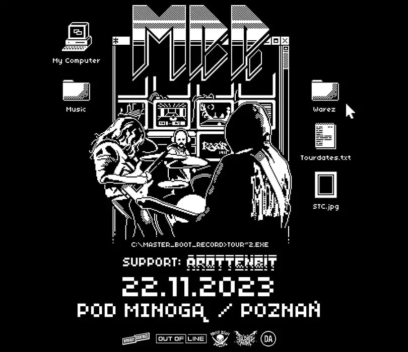 Zapraszamy na niezapomnianą muzyczną podróż do świata synth-metalu z zespołem Master Boot Record, który wystąpi już 22 listopada 2023 roku w klubie Pod Minogą w Poznaniu! To wyjątkowy koncert, który przeniesie uczestników w pełen tajemniczych zagadek i nostalgicznych dźwięków świat MBR, którzy tego wieczoru wspierani będą przez projekt Arottenbit. Master Boot Record (MBR) to wyjątkowy projekt muzyczny, którego twórczość łączy chiptune, muzykę klasyczną i avant-synth-metal. Zespół zadebiutował w 2016 roku i od tamtej pory zdobył uznanie swoją rosnącą dyskografią, inspirowaną klasycznymi programami komputerowymi i grami wideo. Jednak to nie wszystko, co wyróżnia MBR. Ich albumy są znane z ukrytych zagadek i wiadomości, które wprowadzają słuchaczy w fascynujący świat retro-cyberpunka. Debiutancki album pod nazwą Master Boot Record ukazał się dopiero w 2019 roku, choć zespół pojawił się online już w 2016 roku, prezentując cyfrowy album C:>FIXMBR. Od tego momentu MBR konsekwentnie wydaje minialbumy i pełnowymiarowe albumy, pełne glitchowych, ale jednocześnie melodyjnych utworów, takich jak Virus.Dos czy Internet Protocol. Grupa nie zapomina również o fanach gier wideo, regularnie wydając single z coverami muzyki z klasycznych tytułów, takich jak DOOM, Castlevania czy Zelda. MBR podkreśla swoje nawiązania do estetyki retro-cyberpunka również poprzez wyjątkowy format swoich albumów. Master Boot Record to zespół, który łączy różne style muzyczne i inspiracje w niepowtarzalny sposób. Ich dźwięki przenoszą słuchaczy do świata retro-cyberpunka, oplecionego tajemniczymi zagadkami i oryginalnym językiem. Nie przegapcie okazji, by dołączyć do MBR na ich koncercie w Poznaniu! Przygotujcie się na niezapomniane doświadczenie muzyczne, które porwie was w wir elektronicznych dźwięków i wprowadzi do światów wirtualnych. Swoje przybycie do klubu zaplanujcie odpowiednio wcześniej, żeby zobaczyć Arottenbit - projekt dowodzony przez Gallo, który przekona nas, że muzykę można tworzyć również bez użycia instrumentów. W świecie zdominowanym przez starzejące się technologie Arottenbit stara się je spożytkować i przez swoje kompozycje tchnąć w nie nowe życie. MASTER BOOT RECORD Support: Arottenbit 22.11.2023 Poznań, Pod Minogą BILETY: Punkty sprzedaży: www.winiarybookings.pl, Going, Empik Bilety. ⚠Szanowni Państwo. Prosimy o kupowanie biletów wyłącznie w autoryzowanych punktach sprzedaży. Poprzez kupno wejściówek od osób trzecich możecie zostać Państwo oszukani.⚠️ Wstęp na koncert 13+ za pisemną zgodą rodzica. Poniżej 13 lat, wymagana obecność pełnoprawnego opiekuna. Wzór zgody: https://bit.ly/WiniaryBookings_ZgodaRodzica Regulamin wydarzenia: https://winiarybookings.pl/regulamin/ W trosce o środowisko zachęcamy Was do pokazywania biletów na telefonie zamiast ich drukowania. MASTER BOOT RECORD - synth metal https://www.facebook.com/masterbootrecordmusic https://www.instagram.com/masterbootrecord “80386” - https://www.youtube.com/watch?v=fZUCxE3hsME “80486DX” - https://www.youtube.com/watch?v=q2CbHKPx36w “C:\DEFRAG” - https://www.youtube.com/watch?v=R77CC9D0sYI AROTTENBIT - gameboy techno punk https://www.facebook.com/arottenbit666 https://www.instagram.com/arottenbit “LSDJ” - https://www.youtube.com/watch?v=YS6ES2z4bd8 --------------------------------------- Wpadaj na Instagram ➡ http://bit.ly/Nasz-instagram Polub nasz profil ➡ http://bit.ly/Nasz--Facebook