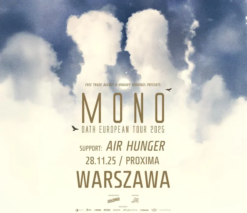 Japoński zespół MONO powraca do Polski! Postrockowa formacja wystąpi 27 listopada w krakowskim klubie Kwadrat i dzień później w warszawskiej Proximie, gdzie promować będzie płytę “Oath”. Jako support na obu koncertach wystąpi Air Hunger. Ćwierć wieku działalności MONO przyniosło ich 12 dużych albumów oraz poskutkowało renomą jednego z najaktywniejszych zespołów wywodzących się z Kraju Kwitnącej Wiśni. Założona w 1999 roku w Tokio formacja od swych początków w unikalny sposób łączy poruszające orkiestrowe aranżacje z hipnotyzującym gitarami, czego wypadkową jest najwyższej klasy post-rock. Grupa każdego roku gra blisko 150 koncertów, na swoim koncie mają już wizyty w ponad 60 krajach, a ten intensywny tryb w pozytywny sposób przekłada się na występy Japończyków, które za każdym razem wciągają swoją głębią i cieszą się dużym zainteresowaniem w rockowym środowisku. W połowie czerwca 2024 roku premierę miał dwunasty krążek w ich dyskografii, “Oath”. Przy nagrywaniu go i produkcji zespół po raz kolejny w swojej karierze współpracował z legendarnym, zmarłym w zeszłym roku inżynierem dźwięku Stevem Albinim. Na nowym materiale MONO raz jeszcze zabierają słuchacza w wysoce emocjonalną podróż, a już w listopadzie będziemy mogli doświadczyć jej na żywo w Krakowie oraz Warszawie! Air Hunger to solowy projekt Dawida Schindlera, w którym abstrakcyjne, drone’owe tekstury przenikają się z oszczędnymi kompozycjami na głos i gitarę. Jego wydawnictwa pojawiały m.in. na antenie NTS i Dublab, a twórczość przykuła uwagę takich artystek i artystów jak Ethel Cain, Montell Fish czy Maria Somerville.W ostatnim czasie Schindler występował m.in. u boku Williama Basinskiego, a obecnie pracuje nad nowym materiałem — jego fragmenty będzie można usłyszeć na nadchodzących koncertach.MONO Support: Air Hunger27.11.2025 / Kraków, Kwadrat28.11.2025 / Warszawa, Proxima BILETY:https://bit.ly/MONO_KRK https://bit.ly/MONO_WWA Punkty sprzedaży: www.winiarybookings.pl, Going, Empik Bilety.Szanowni Państwo. Prosimy o kupowanie biletów wyłącznie w autoryzowanych punktach sprzedaży. Poprzez kupno wejściówek od osób trzecich możecie zostać Państwo oszukani.Wstęp na koncert 13+ za pisemną zgodą rodzica. Poniżej 13 lat, wymagana obecność pełnoprawnego opiekuna.Wzór zgody: https://bit.ly/pisemna_zgoda_rodzica Regulamin wydarzenia: https://winiarybookings.pl/regulamin/ W trosce o środowisko zachęcamy Was do pokazywania biletów na telefonie zamiast ich drukowania.
