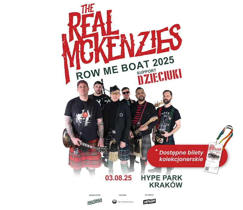 The Real McKenzies zagrają w Polsce! Ta szalona grupa awanturników w unikalny sposób łączy wpływy kultury szkockiej z gitarowym brzmieniem, które będzie można usłyszeć 3 sierpnia w krakowskim Hype Parku oraz dzień później w warszawskiej Proximie. Jako support wystąpi grupa Dzieciuki!Bez cienia wątpliwości można powiedzieć, że The Real McKenzies to zespół nie do podrobienia. Grupa założona w 1992 roku przez barwnego poetę - kontestatora, Paula McKenziego, to wesoła banda buntowników podążających własną ścieżką. Spędzili ponad 30 lat, podróżując po świecie, żeby grać dla coraz większej rzeszy awanturników i lekkoduchów. Niewiele zespołów może pochwalić się karierą trwającą tak długo, tak niezwykle pełną przygód, dziką, burzliwą i wręcz igrającą ze śmiercią. Są niepowstrzymaną siłą koncertowego szaleństwa. Od dzielenia sceny z takimi zespołami jak NOFX, Rancid, Flogging Molly, Metallica czy Shane McGowan, po występy w filmach, książkach i grach wideo, aż po podpisanie kontraktu z legendarną wytwórnią Fat Wreck Chords – ich historia wciąż zadziwia.Na przestrzeni ponad trzech dekad istnienia, The Real McKenzies wydali 12 płyt studyjnych. Najnowszym krążkiem grupy jest „Songs of the Highlands, Songs of the Sea” z 2022 roku, który w śmiały sposób pokazuje, że nie mają zamiaru się zatrzymywać.Dzieciuki to białoruski zespół folk-punkowy, który został założony w Grodnie w 2012 roku. Jego nazwa w tłumaczeniu oznacza “dzieciaki” i nawiązuje do zwrotu, którym Konstanty Kalinowski zwrócił się w broszurze do chłopów, wzywając ich do udziału w powstaniu styczniowym. W zeszłym roku grupa została uznana przez reżim Łukaszenki za “ekstremistyczną”, a jej działalność w kraju została zakazana. W wyniku represji muzycy byli zmuszeni do emigracji z Białorusi. 03.08.2025 KRAKOWHYPE PARK04.08.2025 WARZAWAPROXIMASUPPORT: DZIECIUKI 18:30 DRZWI19:30 DZIECIUKI20:40 THE REAL MCKENZIESPunkty sprzedaży: www.winiarybookings.pl , Going, Empik Bilety. Szanowni Państwo. Prosimy o kupowanie biletów wyłącznie w autoryzowanych punktach sprzedaży. Poprzez kupno wejściówek od osób trzecich możecie zostać Państwo oszukani. Wstęp na koncert 13+ za pisemną zgodą rodzica. Poniżej 13 lat, wymagana obecność pełnoprawnego opiekuna.Wzór zgody: https://bit.ly/WiniaryBookings_ZgodaRodzica Regulamin wydarzenia: https://winiarybookings.pl/regulamin/ W trosce o środowisko zachęcamy Was do pokazywania biletów na telefonie zamiast ich drukowania.