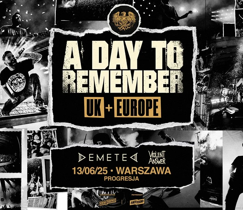 A Day To Remember powracają do Polski! Amerykańska grupa 21 marca podzieliła się ze światem nowym krążkiem “Big Ole Album Vol.1”, a w czerwcu wystąpi na dwóch koncertach w naszym kraju - 13.06. w Warszawie w Progresji oraz dzień później we wrocławskim A2. Oba wieczory otworzą Demeted oraz Violent Answer. A Day To Remember to grupa, której twórczość bazuje na przebojowym połączeniu poppunkowych melodii z metalcorem. Ich mieszanka szybko zyskała zainteresowanie słuchaczy, a z każdym kolejnym albumem grono oddanych fanów powiększało się w zawrotnym tempie. Praktycznie każdy album z ich dyskografii plasowała się na najwyższych miejscach billboardowych notowań w kategoriach rock, indie czy alternatywa, sprzedali ponad milion płyt i wyprzedali wiele tras na całym globie. W marcu nakładem Fueled by Ramen/Atlantic Music Group premierę miał ósmy w dorobku ADTR album “Big Ole Album Vol.1”, a już w połowie czerwca Amerykanie wystąpią dwukrotnie w Polsce - 13 czerwca w Progresji w Warszawie oraz dzień później we wrocławskim A2. Jeśli szukacie złotego środka pomiędzy muzycznym ciężarem a chwytliwą melodyką, to lepiej nie traficie!Przed A Day To Remember rozgrzeją Was dwa strzały z naszej sceny - krakowski Demeted i poznański Violent Answer. O tych pierwszych zrobiło się ostatnio głośno za sprawą ich udziału w talent show, ale warto bardziej skupić się na ich twórczości, bo robią to dobrze. Demeted lubią łączyć agresywne riffy, tłuste breakdowny i łagodne melodie, czym przekonali do siebie amerykańską wytwórnię Seek & Strike, pod skrzydłami której wydali 2 EPki - “Lunacy” w 2022 oraz tegoroczną, jeszcze świeżą “Rituals”. Violent Answer od kilku lat konsekwentnie budują pozycję na rodzimej scenie. Pierwszy cios zadali w 2020 roku EPką zatytułowaną po prostu Violent Answer”, 2 lata później poprawili “Self-Threat”. W tym roku wydali “Shift”, na którym pokazują, że łącząc ze sobą agresję czerpaną z hardcore’u z nu-metalowym groovem, potrafią tworzyć muzykę oryginalną, pozbawioną przywiązania do szufladek.A DAY TO REMEMBERSupport: Demeted, Violent Answer 13.06.2025 / Warszawa, Progresja14.06.2025 / Wrocław, A2Punkty sprzedaży: www.winiarybookings.pl , Going, Empik Bilety. Szanowni Państwo. Prosimy o kupowanie biletów wyłącznie w autoryzowanych punktach sprzedaży. Poprzez kupno wejściówek od osób trzecich możecie zostać Państwo oszukani. Wstęp na koncert 13+ za pisemną zgodą rodzica. Poniżej 13 lat, wymagana obecność pełnoprawnego opiekuna.Wzór zgody: https://bit.ly/WiniaryBookings_ZgodaRodzica Regulamin wydarzenia: https://winiarybookings.pl/regulamin/ W trosce o środowisko zachęcamy Was do pokazywania biletów na telefonie zamiast ich drukowania.
