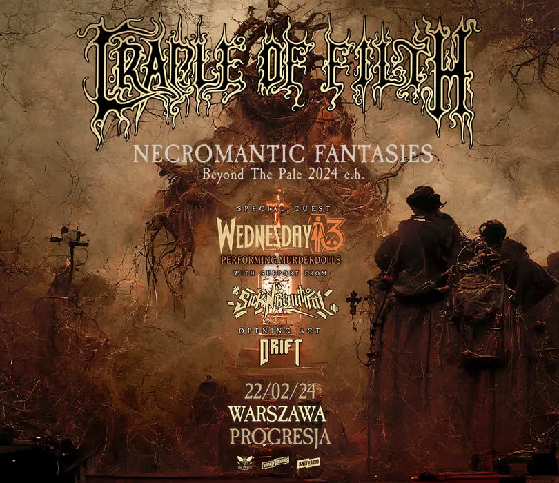 Cradle Of Filth powrócą do Polski po blisko pięcioletniej przerwie i wystąpią w lutym w Gdańsku, Warszawie i Krakowie. Na trasie towarzyszyć im będą: Wednesday 13, którzy zagrają set złożony z utworów Murderdolls oraz Włosi z Sick N’ Beautiful. Cradle Of Filth to zespół-instytucja w świecie ekstremalnego metalu i bez wątpienia jeden z najważniejszych reprezentantów gatunku rodem z Wysp Brytyjskich. Styl dowodzonej przez Daniego Filth’a, założonej w 1991 roku grupy na początku opierał się na black metalu. W późniejszych latach działalności, poprzez dorzucenie wpływów zaczerpniętych z metalu gotyckiego i symfonicznego, muzyka Cradle Of Filth zyskała bardziej komercyjny charakter, co poskutkowało miejscem na międzynarodowych listach przebojów przy okazji albumów “Damnation and a Day” (2003), “Thornography” (2006), “Hammer Of The Witches” (2015), czy “Existence is Futile” (2021). W kwietniu tego roku ukazała się “Trouble and Their Double Lives” - płyta koncertowa oraz pierwszy materiał formacji wydany we współpracy z Napalm Records, na którym znalazły się również dwa premierowe utwory - “She is a Fire” oraz “Demon Prince Regent”. Na 3 polskich koncertach Brytyjczyków wspierać będą: Wednesday 13, czyli solowy projekt wokalisty horror punkowego/glam rockowego Murderdolls, którzy wystąpią z setem złożonym z utworów tego zespołu oraz Sick N’ Beautiful - Włosi łączący metal z elementami industrialu, punka i electro-popu, znani ze swoich wzbogaconych o wizualizacje oraz kostiumy występów na żywo.  Patronem koncertu jest Antyradio CRADLE OF FILTH  +WEDNESDAY 13 (Murderdolls set) + SICK N’ BEAUTIFUL 12.02.2024 Gdańsk, B90 22.02.2024 Warszawa, Progresja 23.02.2024 Kraków, Studio CZASÓWKA 18:00 DRZWI 18:45 DRIFT 19:30 SICK N' BEAUTIFUL  20:15 WEDNESDAY 13 21:30 CRADLE OF FILTH  Szanowni Państwo. Prosimy o kupowanie biletów wyłącznie w autoryzowanych punktach sprzedaży. Poprzez kupno wejściówek od osób trzecich możecie zostać Państwo oszukani.   Wstęp na koncert 13+ za pisemną zgodą rodzica. Poniżej 13 lat, wymagana obecność pełnoprawnego opiekuna. Wzór zgody: https://bit.ly/pisemna_zgoda_rodzica  Regulamin wydarzenia: https://winiarybookings.pl/regulamin/  W trosce o środowisko zachęcamy Was do pokazywania biletów na telefonie zamiast ich drukowania. ➡CRADLE OF FILTH (Wielka Brytania / Napalm Records) - symfoniczny black metal, metal gotycki   https://www.facebook.com/cradleoffilth https://www.instagram.com/cradleoffilth https://www.cradleoffilth.com ”She Is A Fire”: https://www.youtube.com/watch?v=fGrxKLsgidg ”Her Ghost In The Fog”: https://www.youtube.com/watch?v=qRNfeMaUBbo ”Nymphetamine Fix”: https://www.youtube.com/watch?v=6dW6aNAZGTM ➡WEDNESDAY 13 (Stany Zjednoczone) - horror punk, heavy metal  https://www.facebook.com/officialwednesday13 https://www.instagram.com/mrmotherfucker13 https://officialwednesday13.com Murderdolls - ”Dead In Hollywood”: https://www.youtube.com/watch?v=Z7d44j9xXKo Murderdolls - ”White Wedding”: https://www.youtube.com/watch?v=Z7d44j9xXKo Murderdolls - ”Nowhere”: https://www.youtube.com/watch?v=MAmZgnUwxWY ➡SICK N’ BEAUTIFUL (Włochy) - hard rock, modern metal, industrial, electro pop https://www.facebook.com/sicknbeautifulband https://www.instagram.com/sicknbeautifulband https://www.sicknbeautiful.com ”Deep End Dark”: https://www.youtube.com/watch?v=fHXwAzT_CYc ”Tonight We Go To War”: https://www.youtube.com/watch?v=CiJsXPc2MDU ”This Is Not The End”: https://www.youtube.com/watch?v=rjDuH8GHE68 --------------------------------------- Wpadaj na Instagram➡http://bit.ly/Nasz-instagram Polub nasz profil➡http://bit.ly/Nasz--Facebook