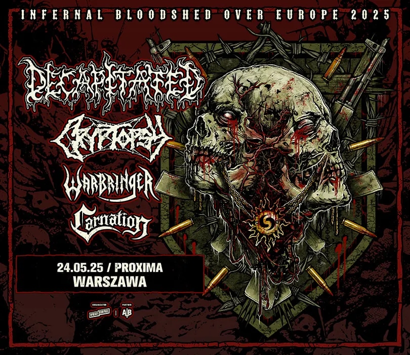Decapitated rusza w trasę! Death metalowe legendy zagrają dwa koncerty w Polsce w ramach trasy „INFERNAL BLOODSHED OVER EUROPE 2025”: w krakowskim Hype Parku 23 maja oraz 24 maja w warszawskiej Proximie. Publiczność rozgrzeje brutalnie intensywna ekipa Cryptopsy, kalifornijski Warbringer oraz Belgowie z Carnation. Nie może cię to ominąć!Decapitated to aktualnie jeden z głównych przedstawicieli death metalu. Zespół założony w 1996 roku przez dwóch braci z Krosna, wspiął się na absolutne wyżyny, podbijając serca fanów gatunku na całym świecie. Każdy kolejny album poszerzał gamę brzmieniową zespołu, nie tracąc autentyczności, ale nadal łamiącą gatunkowe granice. Jak trafnie zauważył Metal Injection, „Każdy szanujący się fan death metalu zna tę nazwę”. Dzikość i pomysłowość ich pierwszych czterech albumów ożywiły scenę death metalową. Zespół od 2009 roku współpracuje z Rafałem “Rasta” Piotrowskim, którego charakterstyczny wokal idealnie komponuje się w brzmienie Decapitated. Ich ostatnia płyta z 2022 roku „Cancer Culture” zwiększyła muzyczną różnorodność poprzez współpracę z artystami z Jinjer i Machine Head, zachowując brzmienie zespołu.Kiedy Cryptopsy pojawili na montrealskiej scenie, ich przełomowe połączenie technicznej wirtuozerii i brutalnej intensywności, wywarło piętno na ekstremalnym metalu. Już na debiutanckim albumie „Blasphemy Made Flesh” pokazali niezrównane umiejętności muzyczne, rozpoczynając karierę pełną innowacji i łamania schematów. Oprócz cenionej dyskografii, ich niestrudzone podejście do pracy i reputacja oszałamiających występów na żywo, ugruntowały pozycję Cryptopsy jako jednego z najbardziej wpływowych i szanowanych zespołów reprezentujących metal ekstremalny. Choć ich dziedzictwo jest bezpieczne, nadal dążą do poszerzania granic ekstremalnej muzyki. Podpisując kontrakt z Season of Mist, przygotowują nowy materiał oraz reedycje klasycznych albumów. Warbringer założony w 2004 roku reprezentuje bezkompromisowy thrash metal prosto z Los Angeles. W 2007 roku podpisali kontrakt z Century Media Records, wydając cztery albumy i intensywnie koncertując na pięciu kontynentach jako headliner oraz support m.in. dla Megadeth, Halford i Iron Maiden. W 2016 roku dołączyli do Napalm Records, rozwijając swoje unikalne brzmienie oraz wydając dwa kolejne krążki. Warbringer ukończyło prace nad swoim 7. albumem studyjnym, który ukaże się w 2025 roku nakładem Napalm Records. Carnation to belgijski zespół death metalowy, założony w 2013 roku w Heist-op-den-Berg. Ich muzyka łączy brutalność klasycznego death metalu z nowoczesną produkcją, inspirowaną zespołami takimi jak Entombed, Morbid Angel i Bolt Thrower. Mocarne riffy, przepełnione gniewem wokale i perkusja tworząca piekielny fundament kreuje agresywne i intensywne show, którego fani ekstremalnego metalu nie mogą przegapić.INFERNAL BLOODSHED OVER EUROPE 202523.05.2025 / Kraków, Hype Park 24.05.2025 / Warszawa, ProximaBILETY: Przedsprzedaż biletów rozpocznie się w piątek, 29 listopada o godzinie 11:00 https://bit.ly/DECAPITATED_KRKhttps://bit.ly/DECAPITATED_WWAPunkty sprzedaży: www.winiarybookings.pl, Going, Empik Bilety Szanowni Państwo. Prosimy o kupowanie biletów wyłącznie w autoryzowanych punktach sprzedaży. Poprzez kupno wejściówek od osób trzecich możecie zostać Państwo oszukani. Wstęp na koncert 13+ za pisemną zgodą rodzica. Poniżej 13 lat, wymagana obecność pełnoprawnego opiekuna.Wzór zgody: https://bit.ly/WiniaryBookings_ZgodaRodzica Regulamin wydarzenia: https://winiarybookings.pl/regulamin/ W trosce o środowisko zachęcamy Was do pokazywania biletów na telefonie zamiast ich drukowania. Decapitated (Polska / Nuclear Blast) – death metalhttps://www.facebook.com/decapitatedwww.instagram.com/decapitatedband🔊 „Iconoclast”: https://www.youtube.com/watch?v=eearDxHbpik🔊 „Homo Sum”: https://www.youtube.com/watch?v=-KFObx3n2K0🔊 „Instict”: https://www.youtube.com/watch?v=nPc2UamnwBI➡Cryptopsy (Kanada / Season of mist) - technical/brutal death metal🌐 https://www.facebook.com/cryptopsyofficial🌐 www.instagram.com/cryptopsyofficial🔊 „In Abeyance”: https://www.youtube.com/watch?v=-uQXG3xLgAI🔊 „The Pestilence That Walketh In Darkness”:https://www.youtube.com/watch?v=AmFLcAraMi0🔊 „Flayed The Swine”: https://www.youtube.com/watch?v=2cKGEeDXovg➡ Warbringer (USA / Napalm Records) – thrash metal🌐 https://www.facebook.com/Warbringermusic🌐 https://www.instagram.com/warbringermusic/🔊 „Remain Violent”: https://www.youtube.com/watch?v=nGl-RT7KX7g&rco=1🔊 „Silhouettes”: https://www.youtube.com/watch?v=Tr3rmfmzlr4🔊 „Crushed Beneath The Tracks ”: https://www.youtube.com/watch?v=6l_Q7GfSxy8➡ Carnation (Belgia / Season of Mist) – death metal🌐 https://www.facebook.com/CarnationBE🌐 https://www.instagram.com/carnationbandofficial/🔊 „Cursed Mortality”: https://www.youtube.com/watch?v=QEkRKjfk2hM🔊 „Chapel of Abhorrence”: https://www.youtube.com/watch?v=rPD6X506Qzs🔊 „Maruta”: https://www.youtube.com/watch?v=0AoNWyrjyd4 ---------------------------------------Wpadaj na Instagram➡http://bit.ly/Nasz-instagramPolub nasz profil➡http://bit.ly/Nasz--Facebook