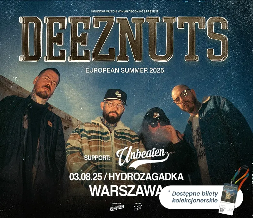 Australijczycy z Deez Nuts powracają do Polski! Grupa wystąpi 3 sierpnia w warszawskiej Hydrozagadce, gdzie na pewno zaserwuje nowości z nadchodzącego albumu! Deez Nuts powstało w 2007 roku po rozpadzie grupy I Killed the Prom Queen, gdzie wokalista grupy, JJ Peters, grał na bębnach. Już rok później zespół wydał swój debiutancki album “Stay True”, który został świetnie przyjęty w rodzimej Australii i promowany był na trasach u boku The Amity Affliction oraz Silverstein. Następne krążki, “This One’s For You” oraz “Bout It”, odbiły się szerokim echem w Stanach oraz Europie i otworzyły formacji drzwi do międzynarodowego koncertowania. Deez Nuts świetnie łączą klasyczny hardcore z elementami rapu (w końcu ich nazwa wzięła się od kawałka Dr. Dre), a koncerty to ich żywioł. Australijczycy powrócą w sierpniu do naszego kraju uzbrojeni w wypuszczone niedawno single “Kill This Shit” oraz “ICU”, które zwiastują następcę wydanego w 2019 roku “You Got Me Fucked Up”!DEEZ NUTS3.08.2025 / Warszawa, HydrozagadkaBILETY: https://bit.ly/DEEZ_NUTS_WWA Punkty sprzedaży: www.winiarybookings.pl, Going, Empik Bilety.Szanowni Państwo. Prosimy o kupowanie biletów wyłącznie w autoryzowanych punktach sprzedaży. Poprzez kupno wejściówek od osób trzecich możecie zostać Państwo oszukani.Wstęp na koncert 13+ za pisemną zgodą rodzica. Poniżej 13 lat, wymagana obecność pełnoprawnego opiekuna.Wzór zgody: https://bit.ly/pisemna_zgoda_rodzica Regulamin wydarzenia: https://winiarybookings.pl/regulamin/ W trosce o środowisko zachęcamy Was do pokazywania biletów na telefonie zamiast ich drukowania.