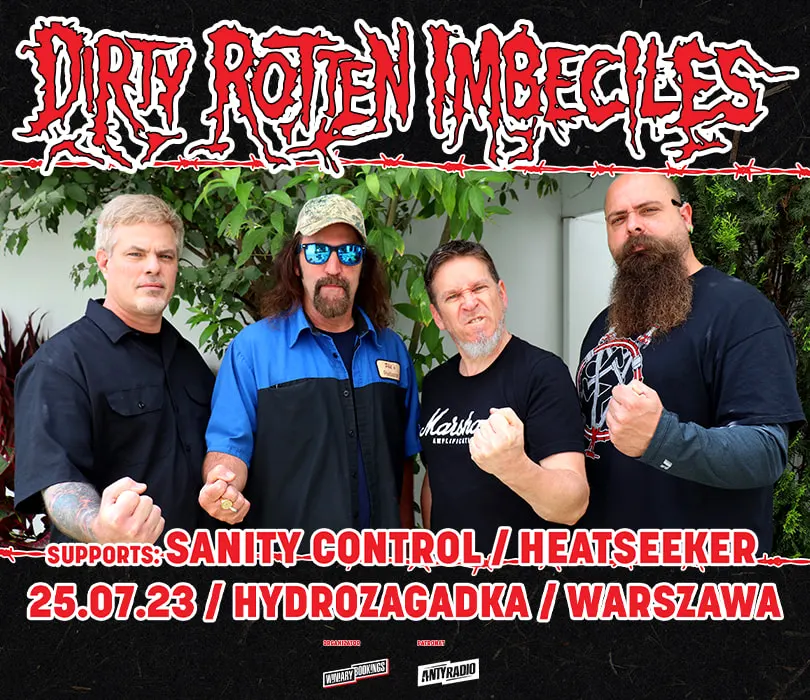 Prekursorzy crossover thrashu powracają na jedyny koncert do Polski! D.R.I. już 25 lipca wystąpią w stołecznej Hydrozagadce! W roli supportów wystąpią lokalne załogi Sanity Control oraz Heatseeker! Historia Dirty Rotten Imbeciles rozpoczęła się 2 maja 1982 roku w okolicach godziny 16:00 w Houston w Texasie. To tego dnia kwartet znany dzisiaj jako D.R.I. za pomocą instrumentów stworzył hałas, który postanowili nazwać swoim pierwszym kawałkiem. Ponad 40 lat później Amerykanie są legendą gatunku, a ich twórczość wpłynęła na takie zespoły jak choćby Anthrax, Kreator, Slayer, Nuclear Assault, Death Angel czy Municipal Waste. Jako jedni z pierwszych połączyli hardcore punk z thrash metalem, czym przyciągali na swoje koncerty zarówno punkowców, jak i metalowców. W ich dyskografii znajdziemy 7 albumów i kilka mniejszych wydawnictw, a ostatnim z nich jest wydana w 2016 EP “But Wait, There’s More!”. Czy w Warszawie usłyszymy jakieś nowości? Tego niestety nie możemy zapewnić, wykluczyć również. Wiemy jednak, że koncerty D.R.I. to po prostu kapitalna energia, więc koniecznie wpadajcie w lipcu do Hydrozagadki! D.R.I. + Sanity Control + Heatseeker 25.07.2023 Warszawa, Hydrozagadka Patronat medialny: Antyradio BILETY: https://bit.ly/DRI_WARSAW Szanowni Państwo. Prosimy o kupowanie biletów wyłącznie w autoryzowanych punktach sprzedaży. Poprzez kupno wejściówek od osób trzecich możecie zostać Państwo oszukani. Wstęp na koncert 13+ za pisemną zgodą rodzica. Poniżej 13 lat, wymagana obecność pełnoprawnego opiekuna. Wzór zgody: https://bit.ly/WiniaryBookings_ZgodaRodzica Regulamin wydarzenia: https://bit.ly/WB_Regulamin W trosce o środowisko zachęcamy Was do pokazywania biletów na telefonie zamiast ich drukowania. D.R.I. (USA) - crossover / thrash https://www.facebook.com/d.r.i.band https://www.instagram.com/dri_band http://www.dirtyrottenimbeciles.com ”Abduction”: https://www.youtube.com/watch?v=-nL_-Yjztsc ”Beneath the Wheel”: https://www.youtube.com/watch?v=WfrIbgSGCqc ”Acid Rain”: https://www.youtube.com/watch?v=YummFZ70WkY SANITY CONTROL (WWA) - crossover / thrash https://www.facebook.com/profile.php?id=100063282065227 sanitycontrol.bandcamp.com War on Life - https://www.youtube.com/watch?v=1rPbFMkgrk0 Death Sentence - https://www.youtube.com/watch?v=mghwv2sHHVo... HEATSEEKER (WWA) - hardcore https://www.facebook.com/heatseekerhc www.heatseekerhc.bandcamp.com Infected Society - https://www.youtube.com/watch?v=lfecftt1LJM On The Ropes 7 - https://www.youtube.com/watch?v=u_mR17FdRVQ --------------------------------------- Wpadaj na Instagramhttp://bit.ly/Nasz-instagram Polub nasz profilhttp://bit.ly/Nasz--Facebook