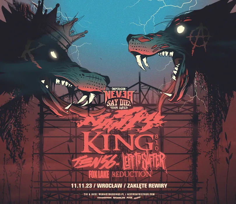 Trasa Impericon Never Say Die! nie ominie naszego kraju również w tym roku! 11 listopada we Wrocławiu, tradycyjnie na scenie Zaklętych Rewirów, jako headlinerów zobaczymy wiele lat wyczekiwane w Polsce Nasty, którzy szykują nowy materiał, zapowiadany dotychczas dwoma potężnymi singlami oraz King 810, którzy na początku roku podzielili się ze światem długo wyczekiwanym, nowym materiałem w postaci epki “follow my tears”. Skład trasy uzupełniają Ten56, Left To Suffer, Fox Lake oraz Reduction. Impericon Never Say Die! Tour 2023 11.11.2023 / drzwi 17:00, start 17:45 Wrocław, Zaklęte Rewiry  Szanowni Państwo. Prosimy o kupowanie biletów wyłącznie w autoryzowanych punktach sprzedaży. Poprzez kupno wejściówek od osób trzecich możecie zostać Państwo oszukani. Wstęp na koncert 13+ za pisemną zgodą rodzica. Poniżej 13 lat, wymagana obecność pełnoprawnego opiekuna. Wzór zgody: https://bit.ly/WiniaryBookings_ZgodaRodzica Regulamin wydarzenia: https://winiarybookings.pl/regulamin/ W trosce o środowisko zachęcamy Was do pokazywania biletów na telefonie zamiast ich drukowania. ►HARMONOGRAM  -------------------------------------------------------------- ◎ Doors 17:00 ① Reduction ② Fox Lake ③ Left To Suffer ④ Ten56 ⑤ King 810 ⑥ Nasty ________________________________________________________ Wpadaj na Instagram http://bit.ly/Nasz-instagram Polub nasz profil http://bit.ly/Nasz--Facebook