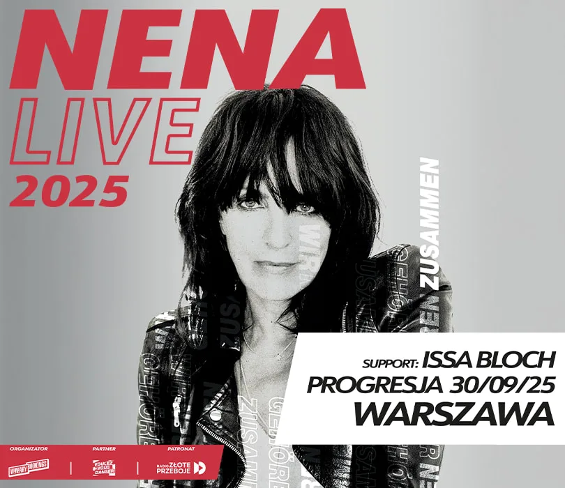 Ikona niemieckiego popu i autorka kultowego hitu "99 Luftballons”, Nena wystąpi w Polsce! Już 30 września jej charyzmatyczny głos i ponadczasowe utwory wypełnią warszawską Progresję. Przygotujcie się na wyjątkowy wieczór pełen emocji i energii! Jako support wystąpi córka Neny, Larissa, ze współtworzonym z Janickiem Zebrowskim projektem Issa Bloch. Nena pozostaje jedną z najbardziej rozpoznawalnych piosenkarek naszych czasów i jednym z najistotniejszych elementów niemieckiej popkultury. Jej energetyczna obecność na scenie jest tak samo charakterystyczna i urzekająca jak jej głos. Każdy koncert na żywo to wyjątkowe rock 'n' rollowe doświadczenie pełne emocji i serca. Tytuł trasy, WIR GEHÖREN ZUSAMMEN, to coś więcej niż tylko motto; to głęboko odczuwane i przeżywane poczucie więzi, które sprawia, że każdy koncert staje się wyjątkowym przeżyciem. Sprzedając 25 milionów płyt na całym świecie, Nena jest jedną z najbardziej docenionych niemieckich artystek wszech czasów. Tworząc muzykę przez cztery dekady, ukształtowała kilka pokoleń fanów, nadal reprezentując styl życia, który rezonuje z każdym na swój sposób. Najnowszym albumem studyjnym artystki jest „Licht” z 2020 roku. Niezależnie od tego, czy są to folkowe akustyczne gitary, czy taneczne elektroniczne rytmy syntezatorów, „Licht” jest nadal tak autentyczne jak pierwsze nagrania artystki.Issa Bloch to projekt tworzony przez wokalistkę i artystkę wizualną Larissę Kerner oraz fotografa i DJ-a Janicka Zebrowskiego. Powstał pod koniec 2022 roku w Hamburgu i od tego czasu rozwija unikalne brzmienie na styku techno i popu, łącząc świetliste melodie z pulsującymi rytmami. Larissa, córka ikony niemieckiej sceny – Neny, od szesnastego roku życia występuje na scenie, a doświadczenie Janicka w sztukach wizualnych i breakdance nadaje projektowi wyjątkową oprawę. Koncerty Issa Bloch to intensywne audiowizualne doświadczenie, które celebruje wolność, wspólnotę i radość płynącą z muzyki.WIR GEHÖREN ZUSAMMEN – Nena Support: Issa Bloch30.09.2025 / Warszawa, ProgresjaPunkty sprzedaży: www.winiarybookings.pl , Going, Empik Bilety.Szanowni Państwo. Prosimy o kupowanie biletów wyłącznie w autoryzowanych punktach sprzedaży. Poprzez kupno wejściówek od osób trzecich możecie zostać Państwo oszukani. Wstęp na koncert 13+ za pisemną zgodą rodzica. Poniżej 13 lat, wymagana obecność pełnoprawnego opiekuna.Wzór zgody: https://bit.ly/WiniaryBookings_ZgodaRodzica Regulamin wydarzenia: https://winiarybookings.pl/regulamin/ W trosce o środowisko zachęcamy Was do pokazywania biletów na telefonie zamiast ich drukowania.