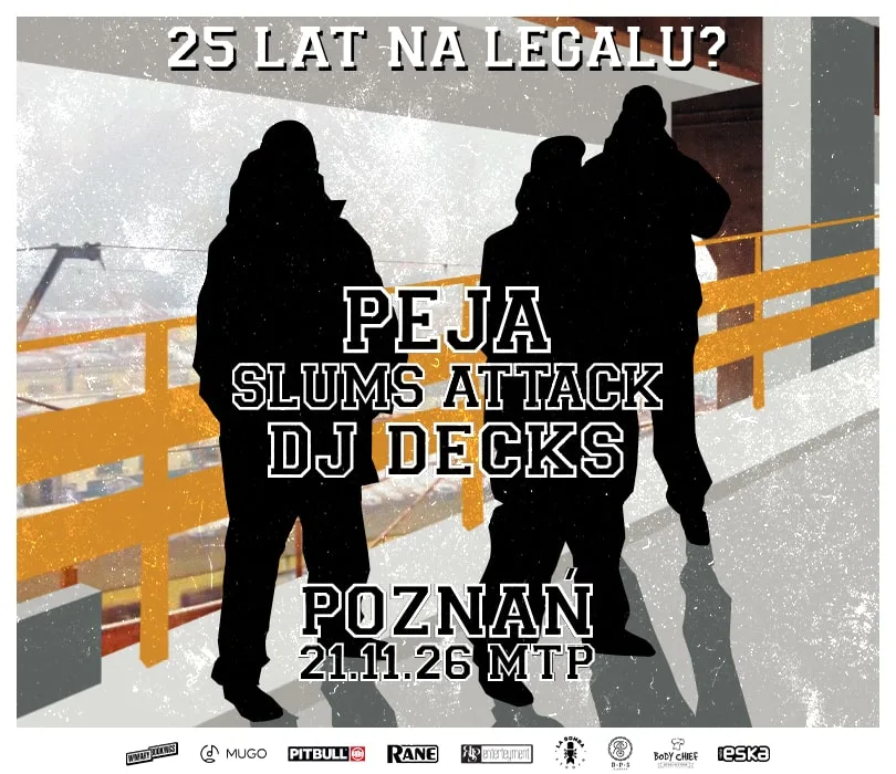 25 lat „Na Legalu?” Peja / Slums Attack wracają do klasyki w swoim mieście. 21 listopada na terenie Międzynarodowych Targów Poznańskich odbędzie się wyjątkowy, jedyny w swoim rodzaju koncert celebrujący rocznicę jednego z najważniejszych albumów w historii polskiego hip-hopu.