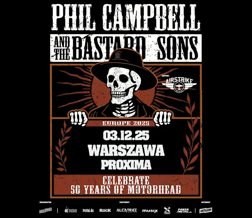 Znany z ponad 30-letniej działalności w Motörhead gitarzysta Phil Campbell powraca do Polski! Wraz ze swoimi synami i wokalistą Joelem Petersem, jako Phil Campbell and the Bastard Sons, zagrają dwa koncerty: 2 grudnia w poznańskim klubie 2Progi oraz 3 grudnia w warszawskiej Proximie, by wspólnie celebrować 50-lecie Motörhead! Jako support zagra niemiecki zespół Airstrike. Po zakończeniu działalności legendarnego zespołu, Campbell nie zwlekał długo z decyzją, co dalej. Wraz z synami i wokalistą Neilem Starrem założył Phil Campbell and the Bastard Sons - projekt, w którym kontynuuje swoją muzyczną ścieżkę na skraju rocka i metalu. Na koncie mają trzy albumy: debiutancki “The Age of Absurdity”, następcę “We’re the Bastards”, a także wydany już z obecnym wokalistą Joelem Petersem “Kings of the Asylum”.W tym roku dowodzona przez gitarzystę grupa zamierza świętować 50-lecie Motörhead. Na jesienną trasę Phil Campbell and The Bastard Sons przygotują specjalny set, na który będą się składać wybrane kompozycje z całej dyskografii kultowego zespołu. To będzie wyjątkowa okazja, żeby usłyszeć klasyki ponownie na żywo! Zespół Airstrike powstał w 2017 roku w północnej Hesji z inicjatywy czwórki bliskich przyjaciół zafascynowanych klasycznym rockiem. W 2021 roku do składu dołączył pochodzący z Peru wokalista Julio Noriega, którego talent szersza publiczność miała okazję poznać rok później w programie The Voice of Germany. Ich debiutancki album “Red Born Reborn” ukazał się we wrześniu 2023 roku, a zespół coraz śmielej zaznacza swoją obecność na europejskiej scenie nowej fali klasycznego rocka.PHIL CAMPBELL AND THE BASTARD SONS celebrate 50 years of MotörheadSupport: Airstrike2.12.2025 / Poznań, 2Progi3.12.2025 / Warszawa, Proxima Szanowni Państwo. Prosimy o kupowanie biletów wyłącznie w autoryzowanych punktach sprzedaży. Poprzez kupno wejściówek od osób trzecich możecie zostać Państwo oszukani.Wstęp na koncert 13+ za pisemną zgodą rodzica. Poniżej 13 lat, wymagana obecność pełnoprawnego opiekuna.Wzór zgody: https://bit.ly/pisemna_zgoda_rodzica_wb Regulamin wydarzenia: https://bit.ly/regulamin_wydarzenia_wb W trosce o środowisko zachęcamy Was do pokazywania biletów na telefonie zamiast ich drukowania.