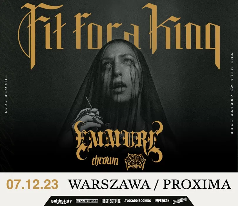 Fit For A King powracają do Europy w roli headlinera i 7 grudnia, w ramach trasy promującej ich ostatnie wydawnictwo “The Hell We Create”, wystąpią w warszawskim klubie Proxima! Gośćmi na europejskich wojażach Amerykanów będą Emmure, Thrown oraz The Gloom In The Corner. Fit For A King potrafią znaleźć idealny balans pomiędzy muzycznym ciężarem i melodiami. Na swoim najnowszym, wydanym w zeszłym roku albumie “The Hell We Create” zespół rozmyśla nad życiowymi traumami i tragediami i jednocześnie zastanawia się nad sposobem stłumienia związanego z nimi bólu. Amerykanie niespełna rok po swoim występie we Wrocławiu przed The Amity Affliction ponownie zagrają w Polsce, tym razem w roli headlinera! Na scenie klubu Proxima zobaczymy również dowodzoną przez Frankiego Palmeriego formację Emmure, która w 2020 roku wydała swoją ostatnią jak dotąd płytę “Hindsight”. Brutalność, chwytliwy beatdown i przede wszystkim uderzająca szczerość - ta mieszanka powinna już przekonać do tego, że koncertu grupy trzeba po prostu doświadczyć na własnej skórze. Wieczór otworzą szwedzki Thrown, które w swojej twórczości miesza brutalnego metalcore’a z hardcorem oraz australijskie The Gloom In The Corner, które promować będzie swój ostatni album “Trinity”. **THE HELL WE CREATE EUROPE TOUR 2023 FIT FOR A KING** +EMMURE, THROWN, THE GLOOM IN THE CORNER 7.12.2023 Warszawa, Proxima drzwi 17:30, start 18:30 **➡FIT FOR A KING (USA / Solid State Records) - metalcore** https://www.facebook.com/fitforakingband https://www.instagram.com/fitforakingtx Falling Through The Sky: https://www.youtube.com/watch?v=NqoctPdxsck End: https://www.youtube.com/watch?v=yZQnffBnIHk The Price Of Agony: https://www.youtube.com/watch?v=Lus0UHs3Hjw **➡EMMURE (USA / Sharptone Records) - deathcore, metalcore, hardcore** https://www.facebook.com/emmure https://www.instagram.com/emmurecult Flag of the Beast: https://www.youtube.com/watch?v=LdEEwRN_YFk Natural Born Killer: https://www.youtube.com/watch?v=SiM7zN0fmwQ Solar Flare Homicide: https://www.youtube.com/watch?v=xn2A_dXoIAA **➡THROWN (Szwecja / Arising Empire) - hardcore** https://www.facebook.com/thrownband https://www.instagram.com/thrownband parasite: https://www.youtube.com/watch?v=-psrO56K6h8 grayout: https://www.youtube.com/watch?v=Lv0u3I-HPJM fast forward: https://www.youtube.com/watch?v=HpI2PEGq5Gc **➡THE GLOOM IN THE CORNER (Australia / Sharptone Records) - metalcore** https://www.facebook.com/tgitcband https://www.instagram.com/thegloominthecornvr New Order: https://www.youtube.com/watch?v=_lBBUlIqQuE Misanthropic: https://www.youtube.com/watch?v=czoneUVvbxw Survivor’s Guilt: https://www.youtube.com/watch?v=qNYkjJKfqkk