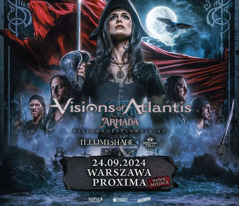 Piraci ze stajni Napalm Records, czyli wykonująca metal symfoniczny grupa Visions of Atlantis, wystąpi 24 września w warszawskiej Proximie! Visions of Atlantis to zespół założony w 2000 roku, w którego skład wchodzą Clementine Delauney, Michele Guaitoli, Christian Douscha, Thomas Caser oraz Herbert Glos. Grupa wyróżnia się na scenie metalu symfonicznego mieszanką damskich i męskich wokali, co w połączeniu ze wzniosłymi refrenami oraz ciężką aranżacją skutkuje twórczością, która przypadnie do gustu nawet najbardziej wybrednym fanom gatunku. Ostatnia na tę chwilę płyta Visions of Atlantis, “Pirates” z 2022, dotarła do pierwszej 20 najlepiej sprzedających się albumów w Niemczech i była promowana m.in. trasą u boku Dragonforce, headlinerskim tournee po Europie oraz na największych festiwalach, w tym na Wacken Open Air, który to występ uwieczniony został na koncertówce “Pirates over Wacken”. W 2024 formacja powróci na europejskie szlaki i 24 września wystąpi na jedynym koncercie w Polsce! Wieczór otworzy szwajcarska grupa Illumishade! Pod koniec stycznia mieliście okazję zobaczyć ich wraz z Delaine w warszawskiej Proximie, gdzie dali fantastyczny koncert. Zespół dowodzony przez wokalistkę Fabienne Erni oraz gitarzystę Jonasa Wolfa (Eluveitie) 16 lutego nakładem Napalm Records podzieli się ze światem albumem “Another Side of You”, na którym muzycznie i lirycznie obiera nowoczesny kierunek.  ARMADA TOUR VISIONS OF ATLANTIS  Szanowni Państwo. Prosimy o kupowanie biletów wyłącznie w autoryzowanych punktach sprzedaży. Poprzez kupno wejściówek od osób trzecich możecie zostać Państwo oszukani. Wstęp na koncert 13+ za pisemną zgodą rodzica. Poniżej 13 lat, wymagana obecność pełnoprawnego opiekuna. **Wzór zgody:** https://bit.ly/pisemna_zgoda_rodzica **Regulamin wydarzenia:** https://winiarybookings.pl/regulamin/ W trosce o środowisko zachęcamy Was do pokazywania biletów na telefonie zamiast ich drukowania. VISIONS OF ATLANTIS (Napalm Records) - metal symfoniczny  ”Clocks”: https://www.youtube.com/watch?v=vgDBg6aiRNk ”Master the Hurricane”: https://www.youtube.com/watch?v=d9wwC93Lzuw ”Legion of the Seas”: https://www.youtube.com/watch?v=NN7eGh86-WQ ILLUMISHADE (Szwajcaria / Napalm Records) - modern metal ?https://www.facebook.com/illumishade ?https://www.instagram.com/illumishade_official ?”Cloudreader”: https://www.youtube.com/watch?v=GS5Q_i71p8Q ?”Here We Are”: https://www.youtube.com/watch?v=W7d0txb-FjI ?”HYMN”: https://www.youtube.com/watch?v=S-63OMmTNQc    --------------------------------------- Wpadaj na Instagram ➡ http://bit.ly/Nasz-instagram  Polub nasz profil ➡ http://bit.ly/Nasz--Facebook